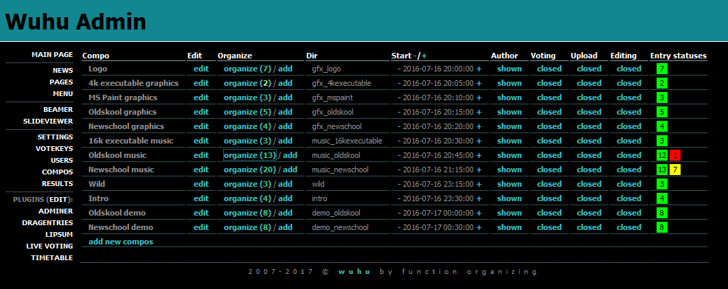 Wuhu is a compact, lightweight Party Management System (PMS), ideally designed for aiding demoparty organizers in tasks such as collecting entries, managing voting and conveying information through the bigscreen.